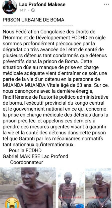 « Nous dénonçons avec la dernière énergie l’indifférence de l’autorité politico-administrative de Boma, de l’exécutif provincial du Kongo Central et du gouvernement national concernant la prise en charge médicale des détenus », a déclaré Gabriel Makiese Lac Profond, coordonnateur de la FCDHD.