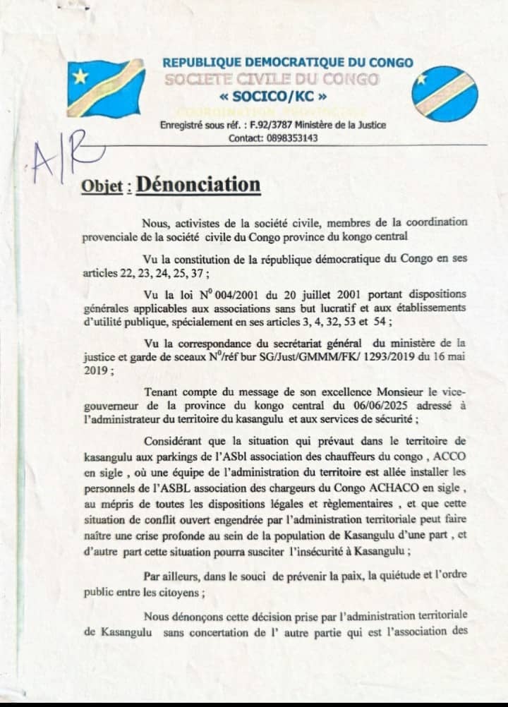 Dans ce document intitulé « Dénonciation », les acteurs de la société civile affirment s’appuyer sur les dispositions constitutionnelles ainsi que sur la loi n°004/2001 régissant les associations sans but lucratif pour contester l’installation, par les autorités locales, de membres d’une association concurrente au sein des parkings relevant de l’Association des Chauffeurs du Congo (ACCO).