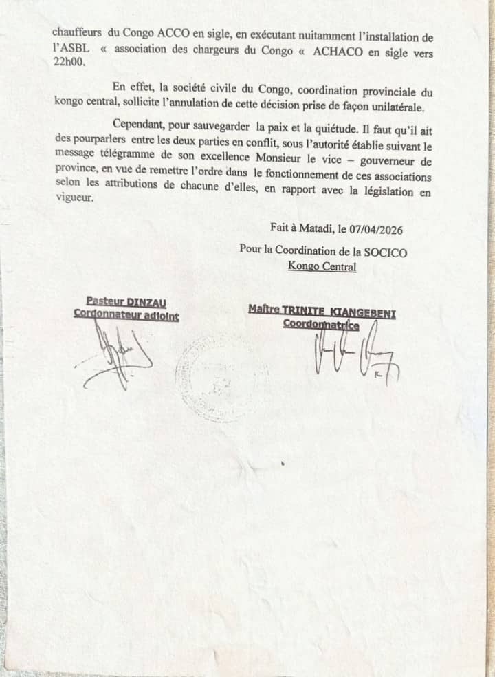 La coordination provinciale de la société civile du Congo au Kongo Central (SOCICO/KC) est montée au créneau pour dénoncer une décision jugée « unilatérale et illégale » prise par l’administration territoriale de Kasangulu, dans une correspondance officielle datée du 7 avril 2026.