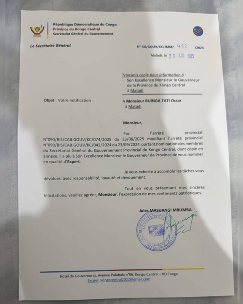 Une correspondance attribuée au gouvernorat du Kongo Central refait surface et suscite débat et interrogations. Datée du 26 juin 2025 et portant le numéro N° SG/GOUV/KC/JMM/462/2025, cette lettre, signée par le Secrétaire général du Gouvernement provincial, Jules Masuangi Mbumbu, annoncerait la nomination de Buinga Tati Oscar comme expert au Secrétariat général du Gouvernement provincial.