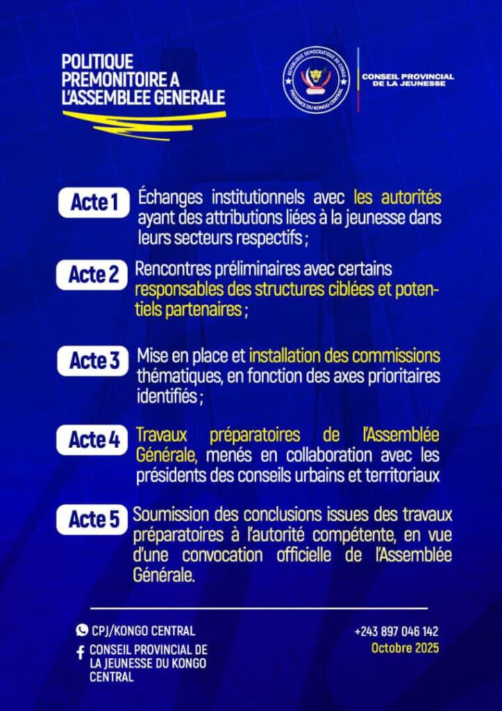Cinq actes majeurs, qualifiés de « politique prémonitoire », ont été adoptés en vue de la prochaine Assemblée générale. Ces mesures visent à renforcer la crédibilité, l’efficacité et l’unité du CPJ-KC, tout en favorisant la participation active des jeunes aux projets et initiatives provinciaux.