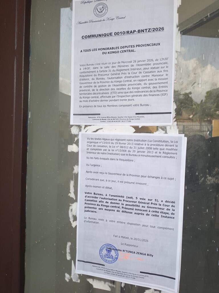 La décision est contenue dans le communiqué officiel n°0010/RAP-BNTZ/2026, signé par le rapporteur de l’Assemblée provinciale, l’Honorable Billy N’Tunga Zenga, et rendu public à Matadi. Le bureau s’est réuni de 12 heures 30 à 14 heures 30, conformément à l’article 31 du Règlement intérieur, afin de statuer sur le réquisitoire du Procureur général près la Cour de cassation.