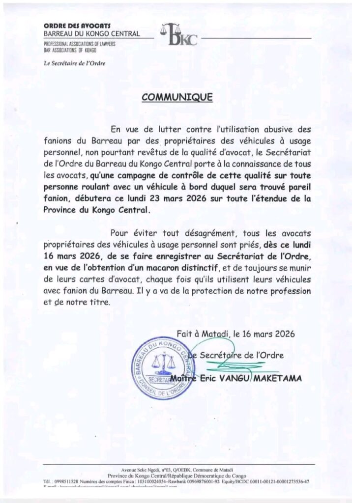 L’Ordre des Avocats du Kongo Central s’associe à cette opération et invite tous ses membres à régulariser l’usage de leurs fanions et à se munir de leur carte professionnelle lorsqu’ils circulent avec ces signes distinctifs. Cette démarche permet de garantir la traçabilité complète et la protection des titres légitimes.Maître Éric Vangu Maketama, Secrétaire de l’Ordre des Avocats, souligne : « Protéger nos instruments professionnels n’est pas seulement une question de formalité, c’est un impératif pour préserver la crédibilité et la sécurité de nos institutions judiciaires ».