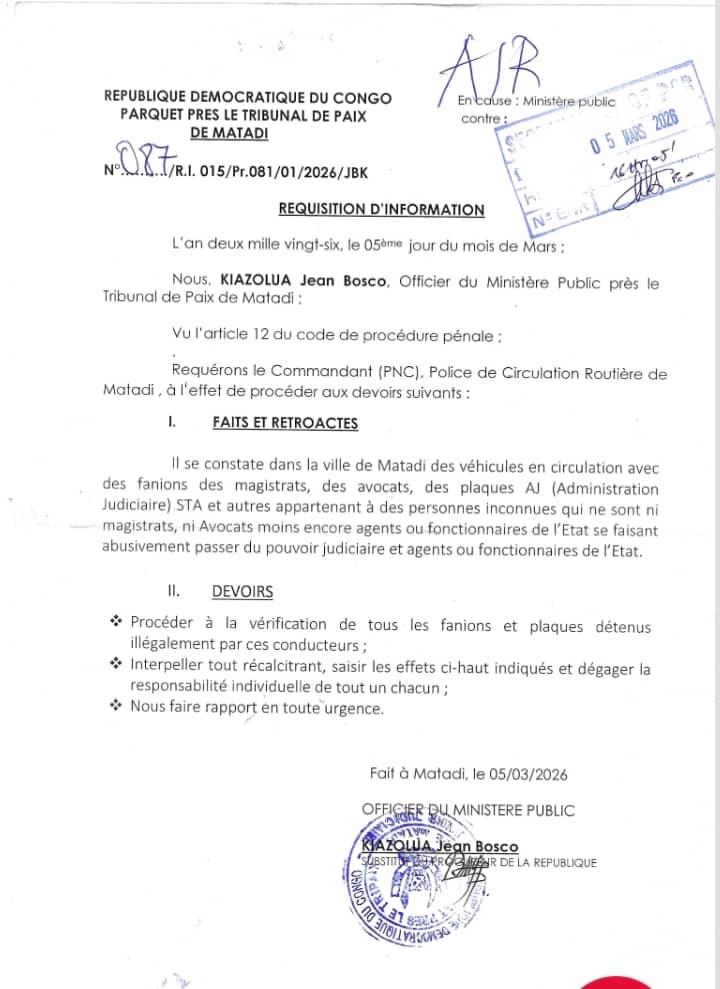 À partir de ce lundi 23 mars 2026, les autorités judiciaires de Matadi, chef-lieu du Kongo Central, lancent un contrôle strict sur toute la province afin de mettre fin à l’usage illégal des fanions et plaques judiciaires sur les véhicules. Cette initiative vise à garantir que seuls les détenteurs légitimes utilisent ces signes d’autorité et à protéger l’intégrité des professions juridiques.
