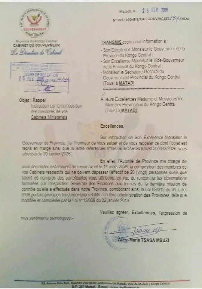 Matadi, Kongo Central – Dans une décision qui redéfinit le fonctionnement institutionnel de la province, le Gouverneur du Kongo Central, Grâce Nkuanga Masuangi Bilolo, a instauré un plafond de 20 membres pour l’ensemble des cabinets ministériels provinciaux, avec une mise en œuvre effective dès mars 2026. Cette directive fait suite aux conclusions détaillées de l’Inspection Générale des Finances (IGF), dont l’audit récent a mis en exergue des disproportions préoccupantes dans la composition des équipes ministérielles.