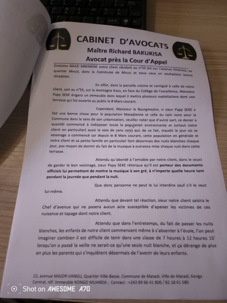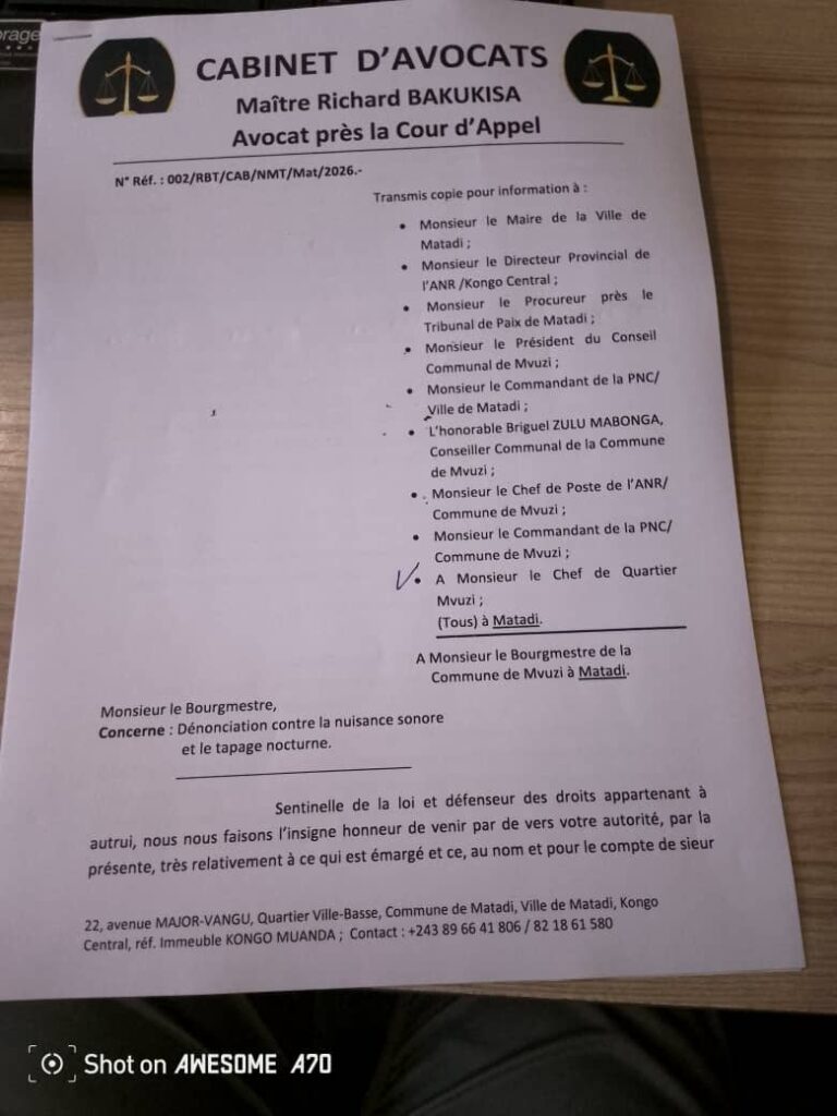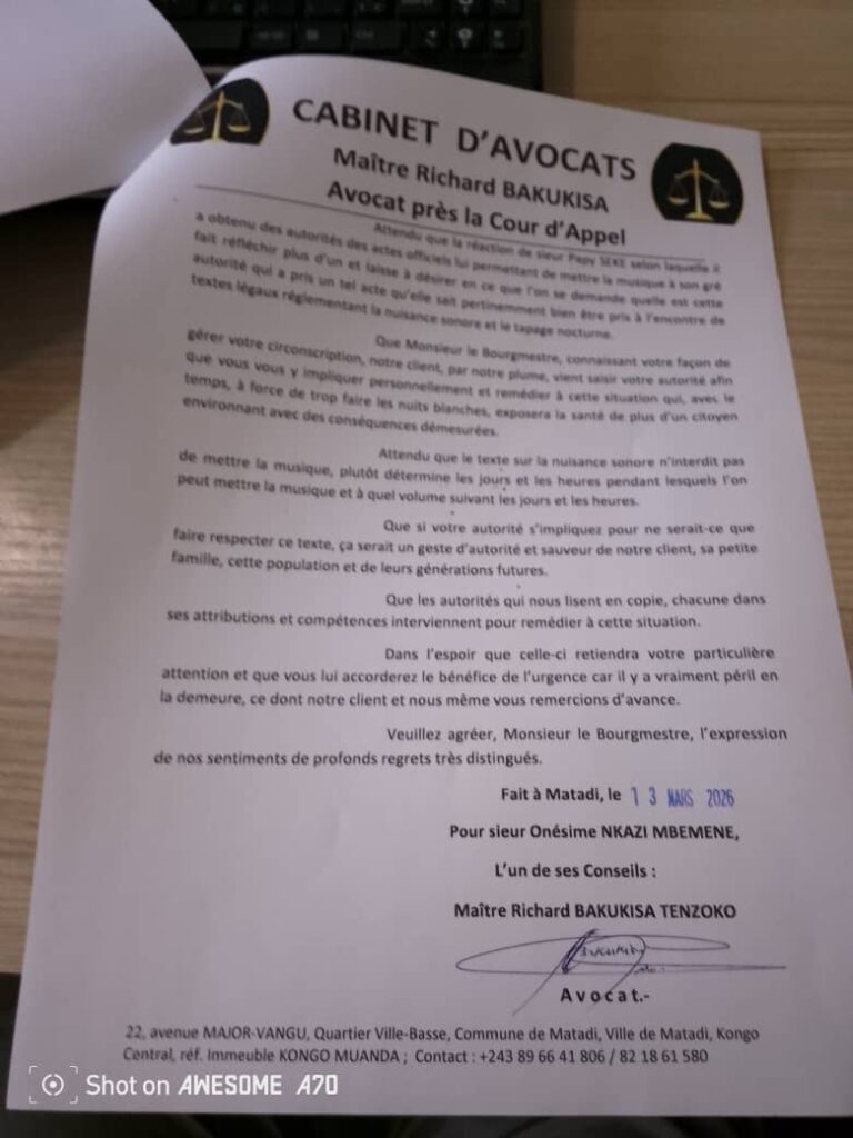 Dans cette lettre datée du 13 mars 2026, le plaignant signale des nuisances sonores répétées qui, selon lui, perturbent la tranquillité des riverains. D’après ce document, transmis en copie à plusieurs autorités administratives et sécuritaires de la ville de Matadi, les nuisances proviendraient d’un immeuble voisin situé sur la montagne Kasu, en face du Collège de l’Excellence. Le propriétaire des lieux, identifié comme Papy Seke, y aurait ouvert au public une terrasse exploitée comme espace de divertissement depuis le 8 mars dernier.