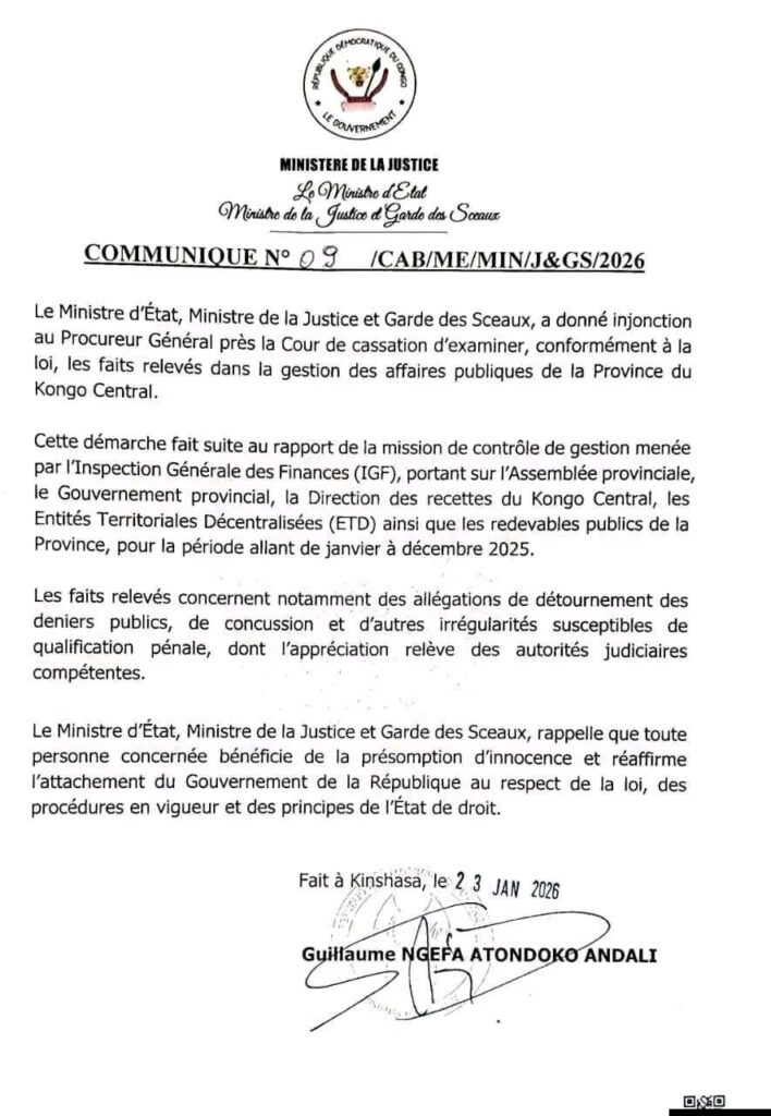 La province du Kongo Central est désormais au centre d’un dossier judiciaire et administratif majeur, à la suite d’un rapport de l’Inspection générale des finances (IGF) sur la gestion des affaires publiques provinciales. Le Procureur général près la Cour de cassation, sur instruction du ministre d’État, ministre de la Justice et garde des Sceaux, a transmis un réquisitoire à l’Assemblée provinciale, qui a déjà été saisie officiellement afin d’examiner l’autorisation d’ouvrir une instruction judiciaire contre le gouverneur et d’autres responsables concernés. Cette étape s’inscrit dans le cadre légal qui encadre les procédures contre les membres de l’exécutif provincial.